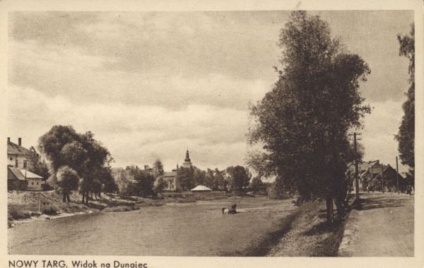 Widok na Dunajec w Nowym Targu. Pod zdjęciem wydrukowany tytuł.