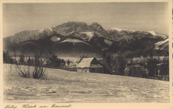 Zabudowania w Zakopanem zimą. W tle Giewont. Pod zdjęciem drukowany tytuł: Tatry. Widok na Giewont.