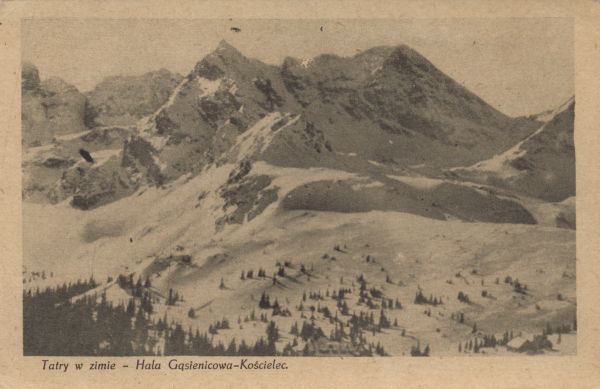 Dolina Gąsienicowa w zimie. W tle Mały Kozi Wierch, Kościelec i Świnica. Pod zdjęciem wpisany tytuł.