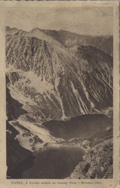 Widok na Czarny Staw i Morskie Oko z Rysów. W tle Miedziane, Opalony Wierch i Kozi Wierch. Pod zdjęciem drukowany tytuł: TATRY. Z Rysów widok na Czarny Staw i Morskie Oko.
