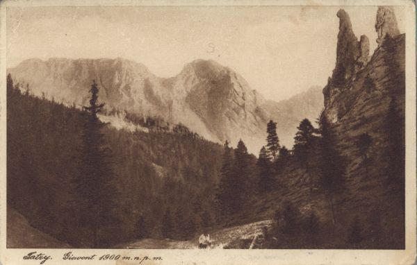 Dolina Strążyska. Z prawej Kominy, w tle Giewont. Pod zdjęciem wydrukowany tytuł.