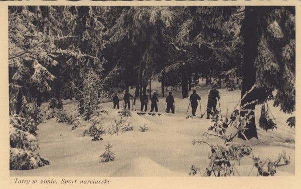 Narciarze wędrujący lasem tatrzańskim zimą. Pod zdjęciem drukowany tytuł: Tatry w zimie. Sport narciarski.