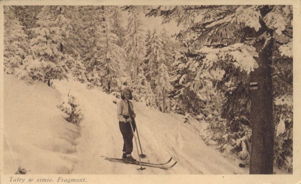 Narciarka w dolinie tatrzańskiej zimą. Pod zdjęciem drukowany tytuł: Tatry w zimie. Fragment.