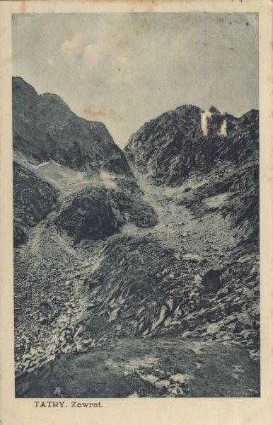 Widok na Zawrat z Doliny G±sienicowej. Pod zdjęciem drukowany tytuł: TATRY. Zawrat.
