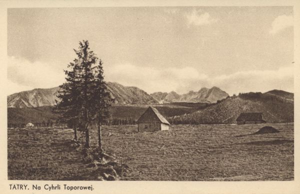 Szałasy w Toporowej Cyrhli. W tle panorama Tatr. Pod zdjęciem drukowany tytuł: TATRY. Na Cyhrli Toporowej.