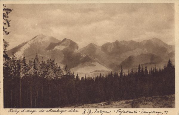 Panorama Tatr z drogi do Morskiego Oka. Z lewej Hawrań i Murań. Z prawej Lodowy Szczyt. Pod zdjęciem drukowany tytuł: Tatry. Z drogi do Morskiego Oka.