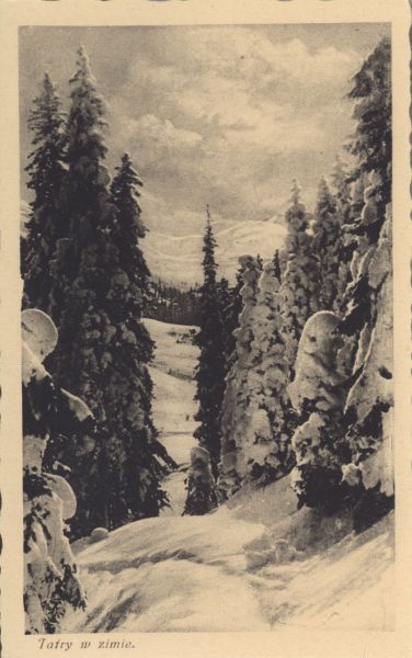 Las tatrzański w zimie. Pod zdjęciem drukowany tytuł: Tatry w zimie.
