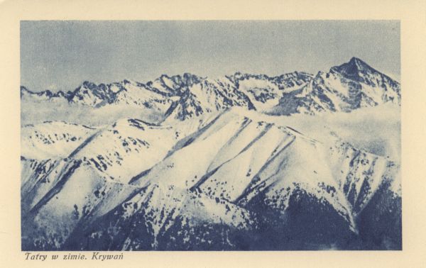 Zimowy widok z Kasprowego Wierchu na Wielką Kopę Koprową, z prawej w tle Krywań. Pod zdjęciem drukowany tytuł: Tatry w zimie. Krywań.