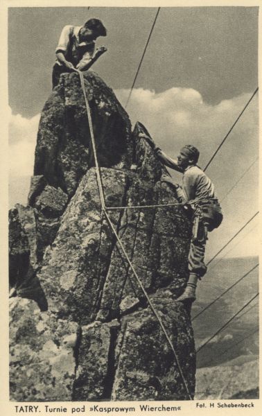 Taternicy wspinający się na jedną z turni pod Kasprowym Wierchem. Pod zdjęciem drukowany opis: TATRY. Turnie pod Kasprowym Wierchem. Fot. H. Schabenbeck.