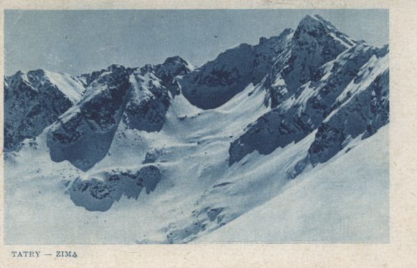 Zimowy widok z Kasprowego Wierchu na Kościelec i Świnicę. Pod zdjęciem drukowany tytuł: TATRY - ZIMĄ.