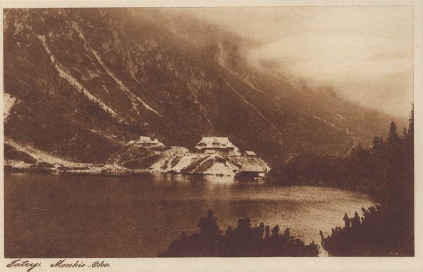Morskie Oko w Dolinie Rybiego Potoku. Nad brzegiem widoczne schronisko. Pod zdjęciem wydrukowany tytuł.