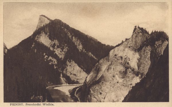 Przechodki Wielkie nad Dunajcem w Pieninach. Pod zdjęciem drukowany tytuł: PIENINY. Przechodki Wielkie.