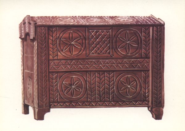 Skrzynia "sarkofagowa" zdobiona snycerką. wieś Sowliny, pow. Limanowa, Podhale.