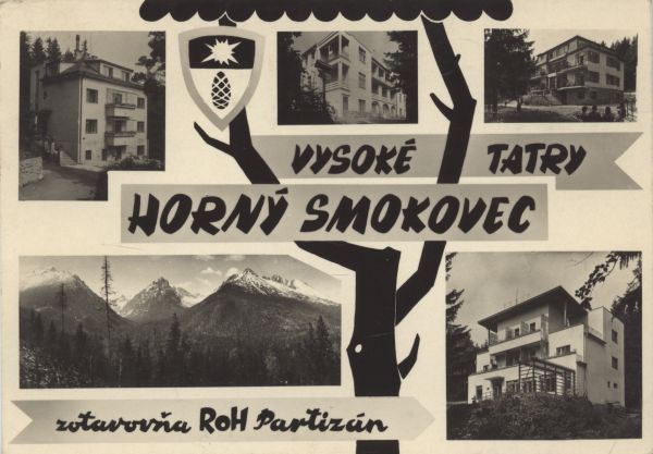 Widok na Tatry Wysokie, od lewej Sławkowski Szczyt, Po¶rednia Grań, Łomnica. W ¶rodku rysunek kierunkowskazu turystycznego, pod nim napisy: Vysoké Tatry - Hornę Smokovec - zotavovòa ROH Partizán.