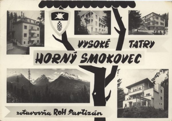 Widok na Tatry Wysokie, od lewej Sławkowski Szczyt, Po¶rednia Grań, Łomnica. W ¶rodku rysunek kierunkowskazu turystycznego, pod nim napisy: Vysoké Tatry - Hornę Smokovec - zotavovòa ROH Partizán.
