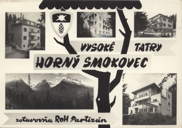 Widok na Tatry Wysokie, od lewej Sławkowski Szczyt, Po¶rednia Grań, Łomnica. W ¶rodku rysunek kierunkowskazu turystycznego, pod nim napisy: Vysoké Tatry - Hornę Smokovec - zotavovòa ROH Partizán.