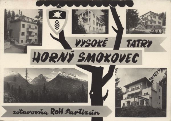 Widok na Tatry Wysokie, od lewej Sławkowski Szczyt, Po¶rednia Grań, Łomnica. W ¶rodku rysunek kierunkowskazu turystycznego, pod nim napisy: Vysoké Tatry - Hornę Smokovec - zotavovòa ROH Partizán.