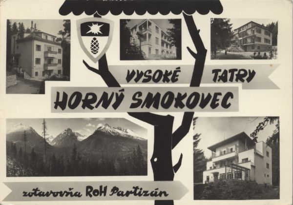 Widok na Tatry Wysokie, od lewej Sławkowski Szczyt, Po¶rednia Grań, Łomnica. W ¶rodku rysunek kierunkowskazu turystycznego, pod nim napisy: Vysoké Tatry - Hornę Smokovec - zotavovòa ROH Partizán.