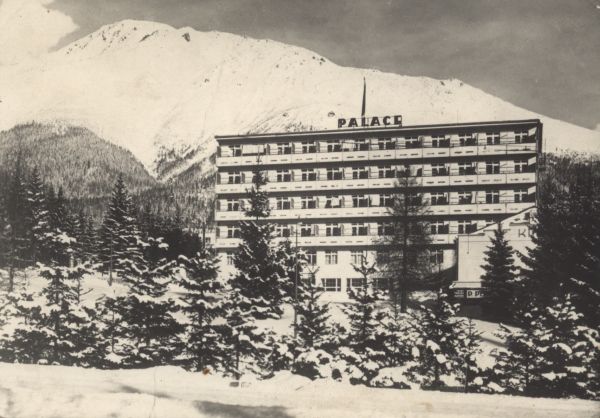 Budynek sanatorium Palace w Nowym Smokowcu w zimowej scenerii. W tle ośnieżony Sławkowski Szczyt.