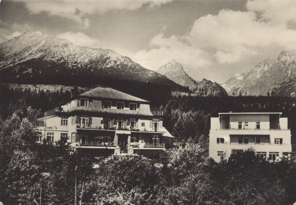 TATRY WYSOKIE - Górny Smokowiec. Dom wypoczynkowy RZZ Partyzant, dom wypoczynkowy Sokół. W tle Sławkowski Szczyt, Pośrednia Grań i Łomnica.