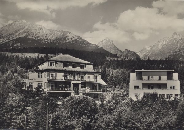 VYSOKÉ TATRY - Horný Smokovec Zotavovňa ROH Sokol, zotatovňa Partizán V pozadí Slavkovský štít (2453 m), Prostredný hrot (2440 m) a skupina Lomnického štítu