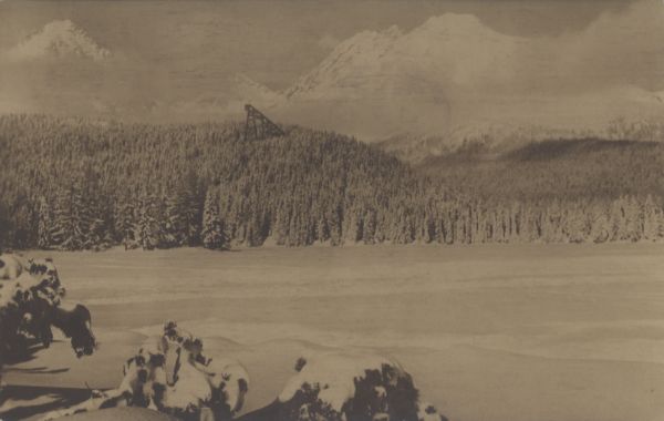 Zamarznięte i pokryte ¶niegiem Szczyrbskie Jezioro. W głębi widać star± skocznię narciarsk±. W tle w chmurach o¶nieżone szczyty: Wielkie Solisko, Szczyrbski Szczyt i Grań Baszt.