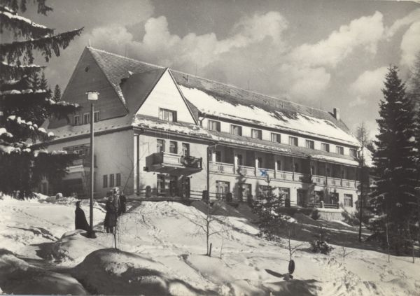 Widok na budynek domu wypoczynkowego - Nowe Życie w zimowej scenerii. Przed budynkiem wczasowicze.