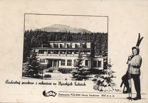 Widok na zwi±zkowy dom wypoczynkowy Polana w Górnym Smokowcu. Po prawej u¶miechniêta turystka z nartami i kijkami. Pod zdjêciem napis: Radostnę pozdrav z rekreácie vo Vysokęch Tatrách, oraz ROH Zotavovòa POLANA Hornę Smokovec 900 m n. m.