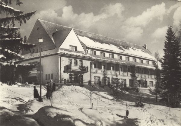 Widok na budynek domu wypoczynkowego - Nowe Życie w zimowej scenerii. Przed budynkiem wczasowicze.