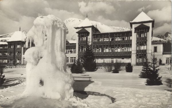 Na pierwszym planie lodowa rzeźba. W głębi zabudowania hotelowe. W tle Sławkowski Szczyt.