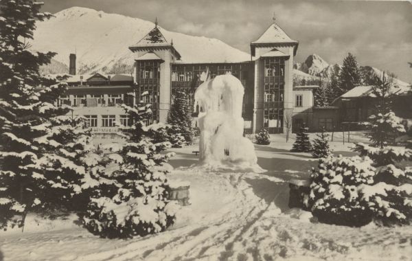 Budynek hotelowy w miejscowości Nowy Smokowiec w zimowej scenerii. Na pierwszym planie zamarznięta fontanna. W tle Sławkowski Szczyt, po prawej Łomnica.