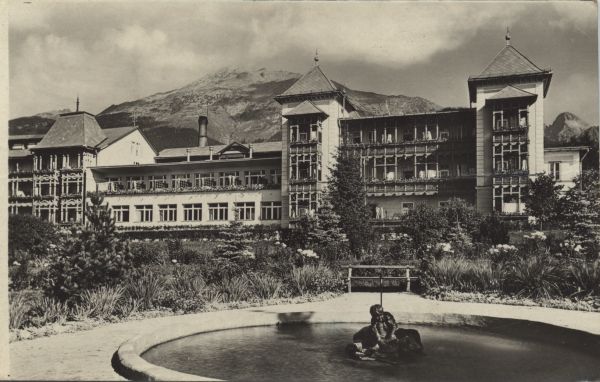 Budynek sanatorium Instytutu Chorób Płuc w miejscowości Nowy Smokowiec. Na pierwszym planie fontanna. W tle Sławkowski Szczyt.