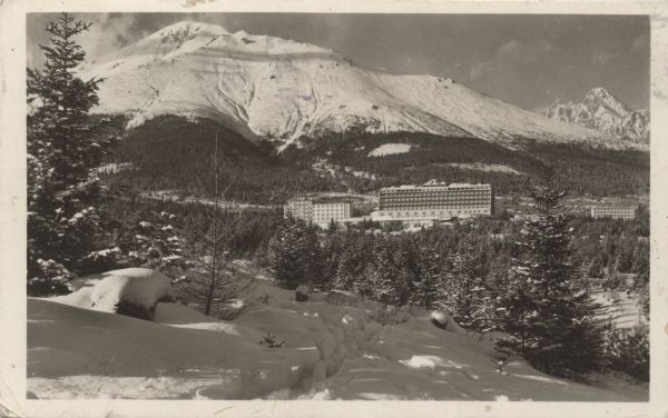 Widok na Sławkowski Szczyt po lewej i Łomnicę po prawej w zimowej scenerii. W części centralnej widać budynki sanatorium w Nowym Smokowcu.
