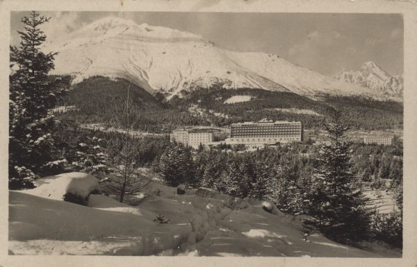 Widok na Sławkowski Szczyt po lewej i Łomnicę po prawej w zimowej scenerii. W części centralnej widać budynki sanatorium w Nowym Smokowcu. Na pierwszym planie wydeptana ścieżka w głębokim śniegu.