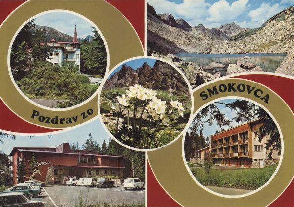 Pocztówka 5. elementowa: Hotel Tokajík w Nowym Smokowcu. Długi Staw w Dolinie Staroleśnej, w tle Baniasta Turnia, Mała Wysoka, Rohatka i Świstowy Szczyt. Hotel Bystrina w Starym Smokowcu. Centrum rekreacji ČSTK. Zawilec narcyzowaty (Anemone narcissiflora L.). Napis: POZDRAV ZO SMOKOVCA.