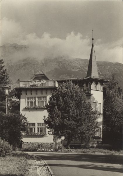 Widok na budynek hotelu Tokajík w miejscowości Nowy Smokowiec. W tle w chmurach Sławkowski Szczyt.