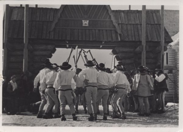 Górale tańczący zbójnicki taniec pod bramą FIS w Zakopanem.