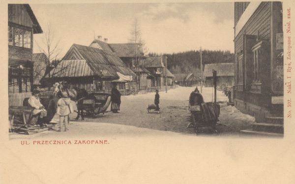 Zabudowania, sanie i mieszkańcy ul. Witkiewicza w Zakopanem.