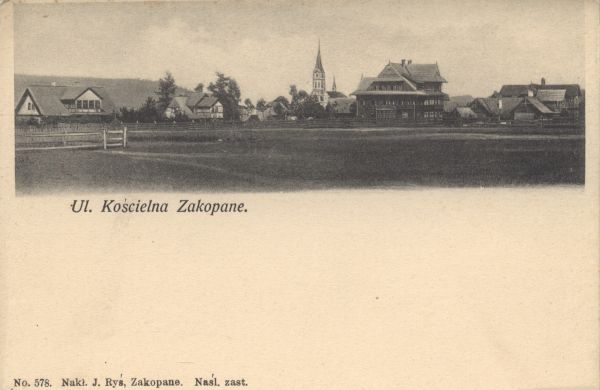 Ul. Kościelna w Zakopanem. Pośrodku widoczny Nowy Kościół.