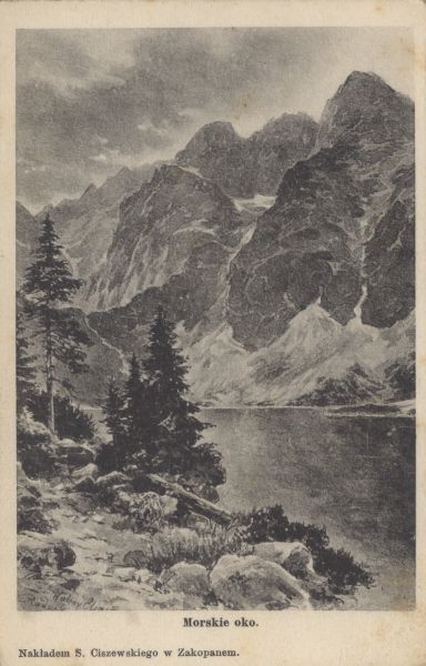 Reprodukcja obrazu Walerego Eljasza - Radzikowskiego pt. Morskie oko. Pod reprodukcją wydrukowany tytuł, na marginesie z lewej strony nakładca.