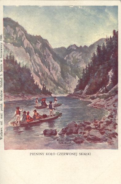 Reprodukcja obrazu Walerego Eljasza - Radzikowskiego pt. Pieniny koło Czerwonej Skałki. Pod reprodukcją wydrukowany tytuł, na marginesie z lewej strony wydawca i nakładca.