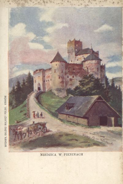 Reprodukcja obrazu Walerego Eljasza - Radzikowskiego pt. Niedzica w Pieninach. Pod reprodukcją wydrukowany tytuł, na marginesie z lewej strony wydawca.