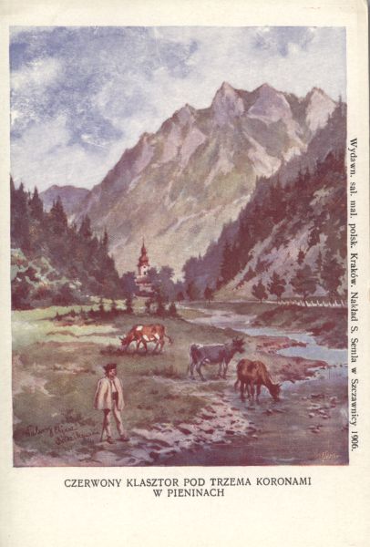 Reprodukcja obrazu Walerego Eljasza - Radzikowskiego pt. Czerwony Klasztor pod Trzema Koronami w Pieninach. Pod reprodukcją wydrukowany tytuł, po prawej stronie wydawca i nakładca.