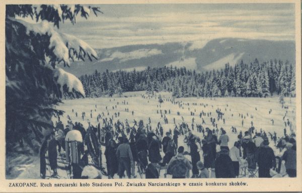 Narciarze i turyści obok Stadionu Polskiego Związku Narciarskiego podczas konkursu skoków narciarskich w Zakopanem w zimie. Pod zdjęciem wydrukowany tytuł.