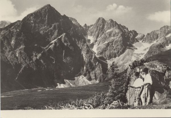 Widok na otoczenie Zielonego Stawu Kieżmarskiego: Mały Kieżmarski Szczyt, Durny Szczyt i Barania Przełęcz. Z prawej na pierwszym planie dwóch górali.