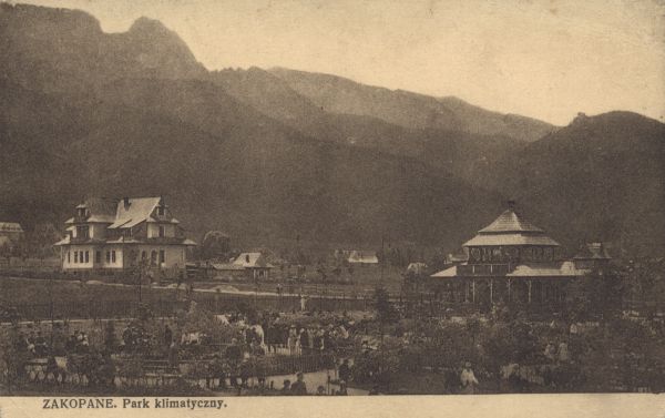 Park klimatyczny w Zakopanem. W tle z lewej Giewont. Pod zdjęciem wydrukowany tytuł.