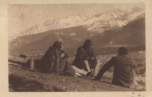 Troje górali na zboczu Gubałówki. W dole Zakopane, w tle ośnieżone szczyty Tatr.