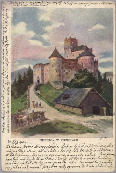 Reprodukcja obrazu Walerego Eljasza - Radzikowskiego pt. Niedzica w Pieninach. Pod reprodukcją tytuł, na marginesie po lewej stronie wydawca. Pod tytułem miejsce na korespondencję - zapisane, podobnie jak i marginesy.