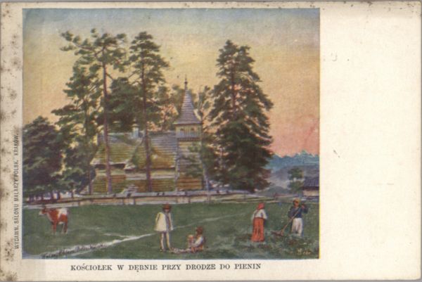 Reprodukcja obrazu Walerego Eljasza - Radzikowskiego pt. Kościółek w Dębnie przy drodze do Pienin. Pod reprodukcją tytuł, na marginesie po lewej stronie wydawca.