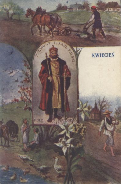 Pocztówka pt. Kwiecień wg. obrazów Walerego Eljasza - Radzikowskiego przedstawiająca sceny rodzajowe ze wsi oraz postać króla Zygmunta I Starego.